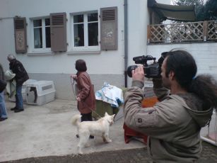 Die ganze Aufregung ging los, als diese ganzen Menschen in mein Tierheim kamen. Sie sprachen so gar nicht meine Sprache. Ich mein, nicht das ich die aus dem Tierheim wirklich verstanden hab, aber Hund tut was er kann. Aber bei denen?!? Zumindest die Gesten waren gleich. Ein paar liefen mit komischen schwarzen Plastikkästen auf den Schultern rum. Vorne dran war ein rundes Glas. Nannten sich Fernsehteam. Wir sollten ständig das gleiche machen. Rein in diese weißen Plastikkisten und wieder raus. Ich weiß nicht, wie oft ich da hin und her gekrabbelt bin. Naja, irgendwann war das vorbei und wir bekamen ordentlich was zu futtern. Das war toll sach ich euch! Danach wurde es dann seltsam. Wieder rein in diese weiße Kiste mit meinem Kumpel Badi. War zwar was eng, aber man kennt sich ja. Unsere Kiste wurde mit weiteren 11 in einen großen blauen Hänger verladen. 3 Reihen hintereinander, 2 unten, 2 oben. Insgesamt waren wir 20. Wir wußten alle nicht so ganz, was wir davon halten sollen. Ja, und dann wurde es 16 Stunden dunkel um uns herum und es schaukelte und ruckelte ständig. Bei einigen, wirkte das deftige Futter vor der Dunkelheit und es kam ein ziemlich unangenehmer Geruch dazu. Einem größeren Kumpel von uns wurde schlecht und er musste sich übergeben. Mensch, was war dem elend. Zum Glück stand seine Box unten!