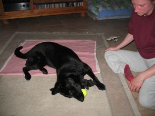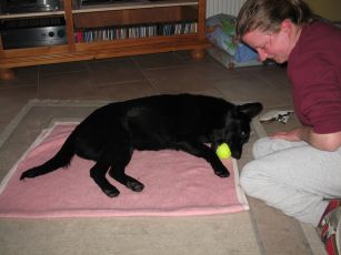Bisher wusste ich nicht was ich damit soll, aber dieses runde Ding, genannt Ball, ist zu verführerisch. Ich muss in ihn reinbeißen.